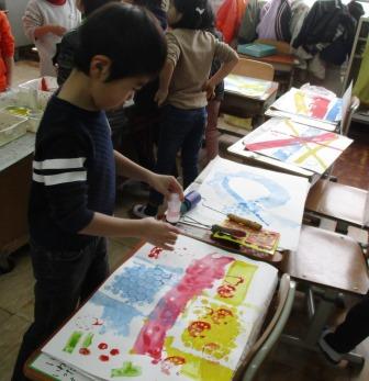 先日,画用紙にローラーを使ってころころ転がして色を付けたところに,いろいろな野菜(レンコン,ニンジン,ピーマン)やカップ,スポンジ,筒などを使ってスタンピングをしました。2組との交流授業で,友だちの様子も見ながら色を付けてポンポンポンポンと,楽しそうに取り組んでいました。最後にパスで色をつけて仕上げます。どんな作品になるのかとても楽しみです。