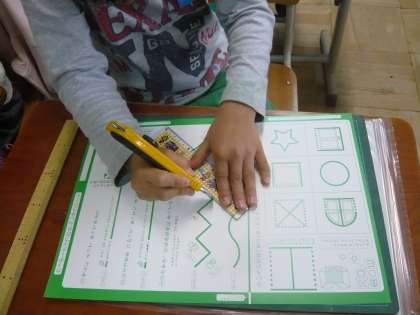 工作マットの上で紙を切るという練習をしました。