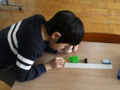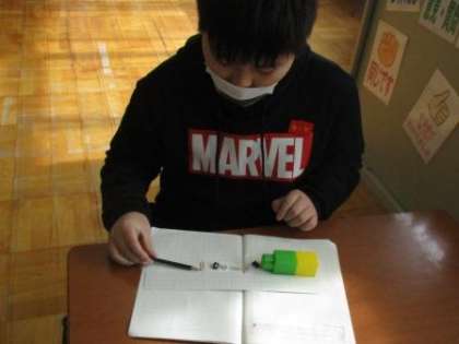 今日の算数の「長さ」の学習では,「いろいろなものを使って30cmの長さをつくろう。」というめあてで学習しました。子どもたちは,あらかじめ用意したブロックやクリップ,積み木や自分のふでばこに入っている鉛筆や消しゴム,のりなどを並べて,端から端までぴったり,まっすぐになるように慎重に並べていました。