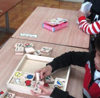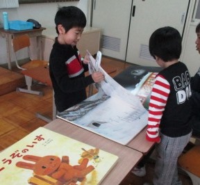 1,2年生で国語の授業をしました。1年生は,積み木の絵を見ながら「これなあに」。2年生は「ひらがな」を読む学習です。学習した後は,積み木を積み上げたりドミノのようにして少し遊んだりしました。次に「大型絵本」を読みました。「どうぞのイス」と「でんしゃでいこう」大きなイラストでとても興味をもって見聞きしていました。これから,いろいろなお話にも興味が広がっていくといいなあと思っています。