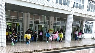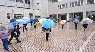 集団登校も2日目、傘をさしての登校です。玄関では子供たちは、傘の雨をしっかりと