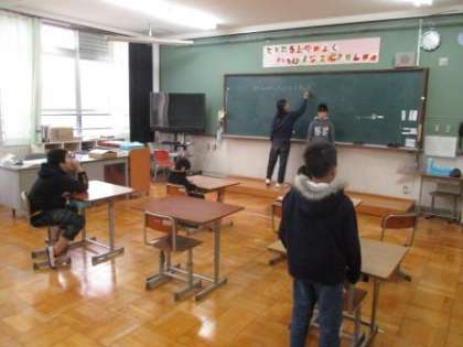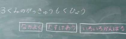 今年度の3組の学級目標。「こんな目標にしたい」と6年生からいろいろな意見が出ました。3組でまだできていないところや1年生も入ってきてもっとこんな学級にしたいといろいろ意見を言う子どもたち。みんなよく考えているなあと感心しました。その意見の中から,3つの言葉を目標にすることにしました。1,2年生もこれでいいと納得。