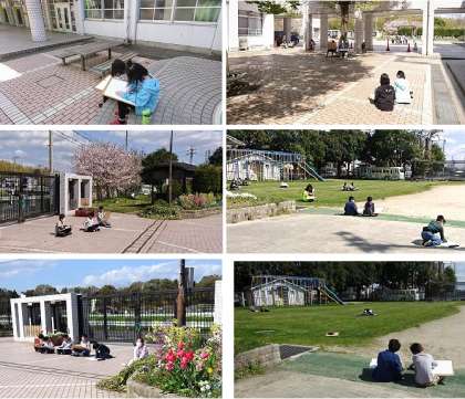 6年生が図工の学習で、「わたしの大切な風景」をテーマに校内の風景を描くことにチャレンジしています。