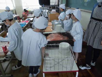 小学校給食がまだ4回目の1年生も,とても上手に給食当番の活動ができるようになってきています。