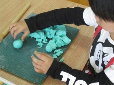 1,2年生の図工の時間に油粘土を使って活動しました。1年生は初めての油粘土です。丸めたり伸ばしたり,へらで切ったり棒にくっつけたりと二人とも工夫しながら行っていました。