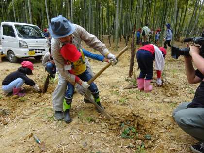 今年も3年生と4年生が竹の子掘りに出かけました。地域の竹の子掘り名人9名の方も来てくださいました。子どもたちは自分のスコップで友だちと協力しながら掘ったり,名人に教えていただきながら掘ったりしていました。全部で200本以上掘ることができました。一人2本ずつ持ち帰ります。今夜の竹の子料理が楽しみですね。