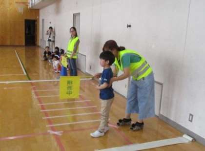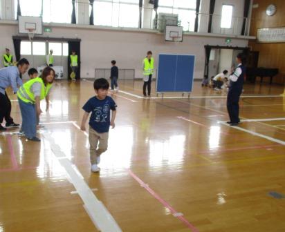 3組の1年生も交通安全教室に参加しました。警察の方のお話を聞いたり,実際に体育館に設定された道路を歩いたりとしっかりと参加することができました。歩道の歩き方や信号も守ることができました。