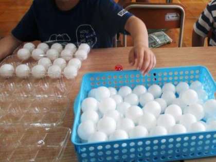 3組にたくさんのピンポン球が届きました。「卵がいっぱい」と子どもたちもとても嬉しそうです。このピンポン球と卵パックを使って,算数の時間に数えたり,10のまとまりを作ったりしました。