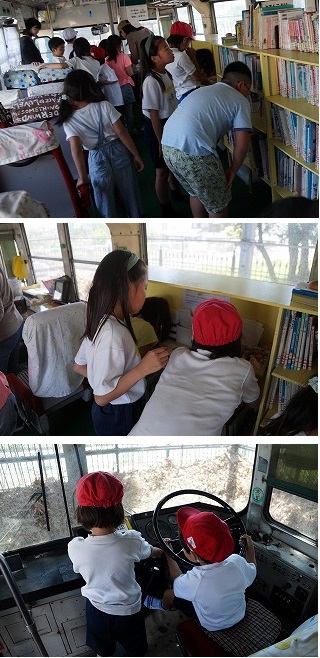 中間休みにはいると,職員室の前で,「ゆうゆう図書館に行こう」と誘い合っている子どもたち。バスに行ってみると,バスの中は結構いっぱいになっていました。本を探している子,借りている子,座席に座って読んでいる子,運転席でハンドルを握っている子など