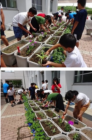 栽培委員会の子どもたちが,地域の方からいただいた,オリズルランなどの苗を植えました。,プランターの数は25個。しっかりと栽培していきます。