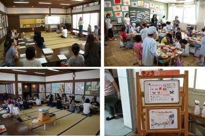 給食試食会では,給食に使用している食材や献立について,また,調理方法などについて栄養教諭から説明をしました。1年生の教室で,子どもたちの準備や食事の様子も見ていただきました。また,本日の給食を試食いただき,使用している食器や給食の量や味などについて知っていただきました。