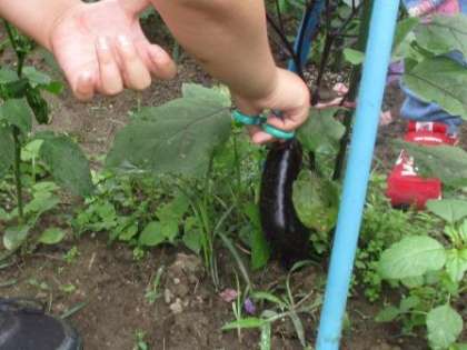 毎日の水やりと天からの恵みの雨が重なり,3組で育てている野菜が大きく育ってきました。花が咲いたり実を付け始めている野菜もあります。水やりの時に,その変化も確かめることができるので,子どもたちも嬉しそうです。先日は,「野菜も栄養をあげると大きくなるよ」と肥料もあげました。野菜を自分たちで育てることで,食生活への関心にもつながっていくといいなあと思っています。