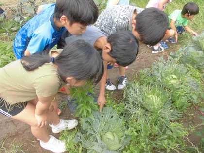 先日,畑にモンシロチョウの卵を探しに行きました。子どもたちは,キャベツの葉の裏にたくさんの卵がうみつけられていることにびっくり!採集から一週間が経ち,かえったモンシロチョウの幼虫は,たくさんキャベツの葉を食べ,すくすくと成長しています。子どもたちは,毎日虫かごを覗き,「大きくなってきた!!」,「色が変わってきたなぁ!」と興味津々です♪