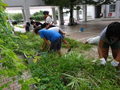 夏休みの間に中庭のプランターにもたくさんの草が生えました。中間休みに栽培委員会の子どもたちが草を抜いてくれました。中間休みの間にきれいになりました。
