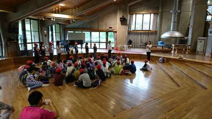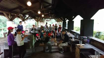3日目の朝を迎えました。みんな元気にしています。写真は,朝の集いと,火起こしの様子です。