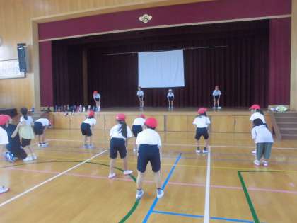 西総合支援学校のお友達との交流会がありました。一緒にEXダンス体操をして,5分間走をした後,バラエティ走をしました。西総合のお友達と手をつないで走ったり,マットで転がったりして,楽しんで取り組んでいました。最後には,みんなで練習してきたパラバルーンをしました。パラバルーンでは,波やロケットなどいろいろな技に挑戦し,みんなにこにこ笑顔でした♪