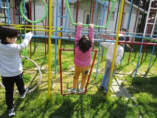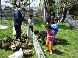 春の暖かい日差しの中,運動場で元気いっぱい活動しました。総合遊具では登ったりくぐったり,動物村では,アイガモやアヒルにえさをあげました。いのちの森では,どんぐりや花,まつぼっくりなどを見つけました。子どもどうしの関わりもたくさん見られました。