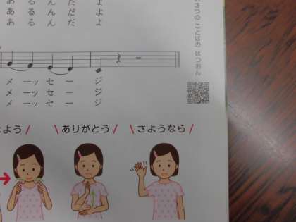 教科書の隅に「QRコード」というものがついているページがあります。あいさつの声や曲などを聞くことができるので,お家の人と一緒に聞けたら聞いてみてくださいね。