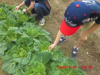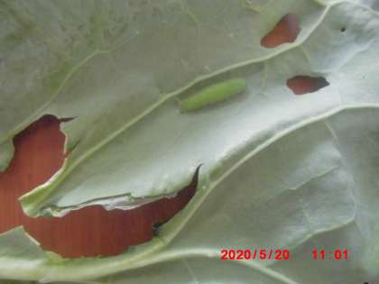 キャベツ畑でみどり色のよう虫をたくさんみつけました。なんのよう虫かな?モンシロチョウのよう虫です。キャベツの葉っぱには,たべたあとのあながたくさんあいていました。