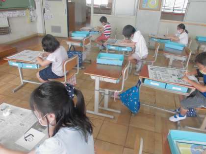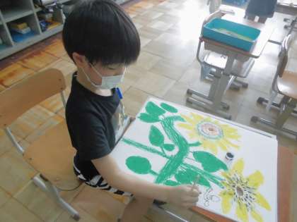 先週描いたひまわりの絵に,割りばしペンで子どもたちを付け足していきました。ひまわり畑で遊んでいる様子を想像しながら,ポーズや表情を工夫することができました!