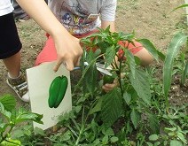 3組の畑のピーマンが大きく育ちました。「ピーマンできているよ」子どもたちもとてもうれしそうです。早速,はさみでチョキン。甘い種類のピーマンなのでどんな味がするのか楽しみです。これから収穫できた野菜は順番におうちへ持って帰ります。楽しみですね。