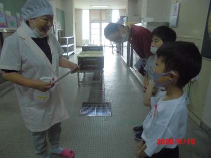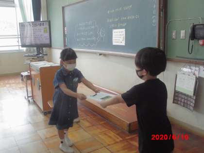 各クラスに届けると,クラスの代表の人や先生が,にこやかに受け取ってくれました。校長室や給食室にも入れていただいて,渡すことができて,子どもたちもうれしそうでした。