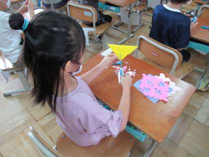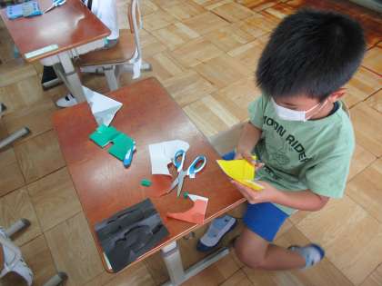 今日の図画工作では,折り紙を折ったり切ったりして