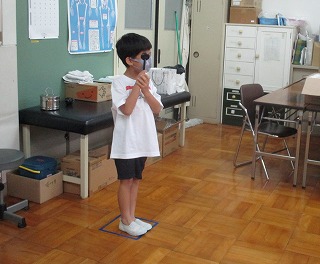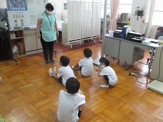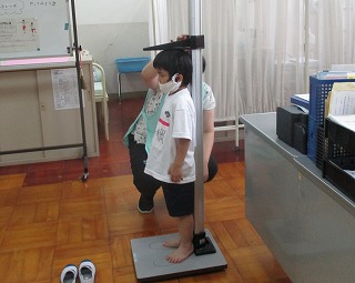 3組の発育測定と視力検査がありました。1年生は初めてです。初めに保健室の先生のお話を聞いたりストレッチを教えてもらったりしました。そのあと,身長と体重をはかりました。2年生のやっているのを見て,とても上手にはかることができました。視力検査もしっかりとできました。この1年間の成長が楽しみです。