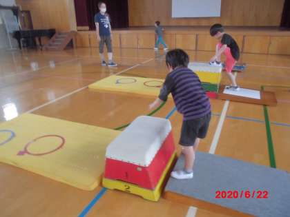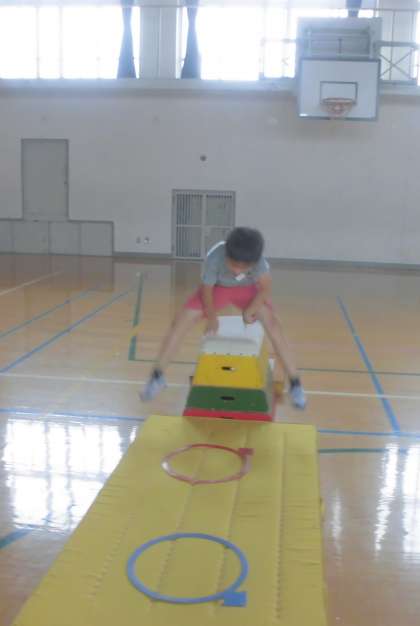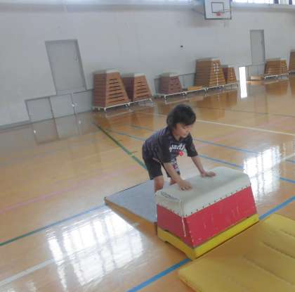 とびばこにのって,とおくまでジャンプしたり,とびばこをふみこしていったりと楽しそうでした。とびばこのかいきゃくとびができるお友だちは,段を高くして挑戦していました。