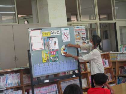 本の分類の仕方や本の探し方を教えてもらった後,ミッション形式でお題に沿った本を探す活動をしました。