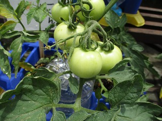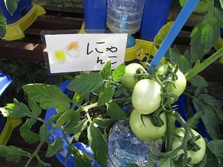 2年生のトマト。3くみの子どもが育てているトマトにも名前をつけました。「にゃんこ」です。好きなキャラクターから考えました。「にゃんこトマト」と呼んでいます。とても大きくなってきました。もうすぐ赤くなりそうですね。