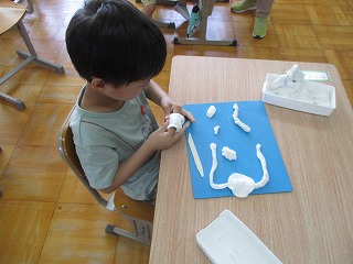 3組の図工では「油粘土」を使って活動しました。丸めたり伸ばしたり,にぎったり,ヘラで切ったりして,できた形からイメージしながらいろいろなものができていきます。子どもたちの発想はすてきですね。