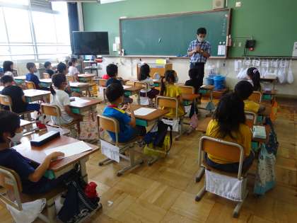 今日は7月の朝会がありました。まだ全校で集まることができないので,校長先生が各クラスを回って,お話をしました。