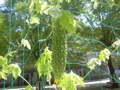 ツルレイシのくきは,ぐんぐん伸びて,黄色い花が咲いて,実ができているものもありました♪