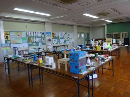 夏休みに取り組んだ自由研究や自由工作などを高学年ホール,しんかんせん通り,コミュニティホールで展示しています。