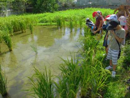 稲の様子をじっくり見ていると,一部稲がなくなっているところがありました。稲の下の方を見た子が「赤いつぶつぶがある!」とタニシの卵を見つけました。吉田先生から,タニシが一部分の稲をすべて食べてしまったことを教えてもらいました。