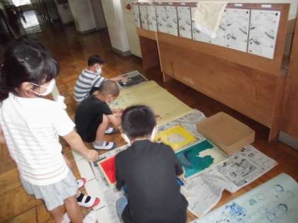 今日は初めて絵の具を使った学習をしました。いろいろな道具をハンコのようにぺったんしたり,筒状のものはコロコロしてみました。最後には,クラスみんなで大きな模造紙にもぺったんコロコロしてみました。手型をつけるのも楽しかったようです。