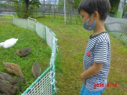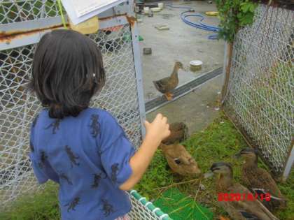 あいがもとあひるとなかよくなるために,今日はえさやりに挑戦しました。