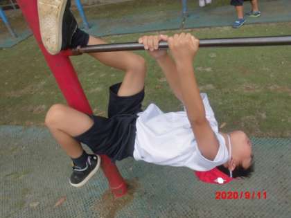 体育「てつぼうあそび」で,もう少しでできそうな『ぶたのまるやき』のわざに挑戦しました。鉄棒を持った後,足を鉄棒に絡ませるために,ぐっと鉄棒に引き寄せるのが難しいです。となりの鉄棒との間の棒をたよりに足を上げていき,できることができました。
