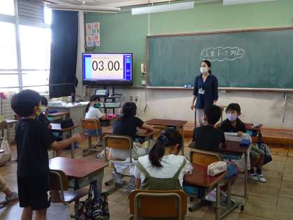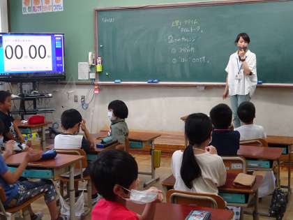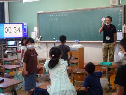 今日は2回目の上里トークタイムでした。今回のテーマは「タイムトーク」。決められた時間の中で,全員がお題について伝えることができるかな? ゲームのように楽しみながら,自分の好きな食べ物や動物などを伝えていました。