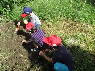 3組の畑では次にブロッコリーを育てる予定をしています。今,ポットの中で少しずつ大きくなっています。畑に植えかえられるように,耕したあとの土をスコップを使って,掘ったり混ぜたりしました。手首にしっかりと力を入れて行っていました。ブロッコリーの苗を植える日が楽しみです。