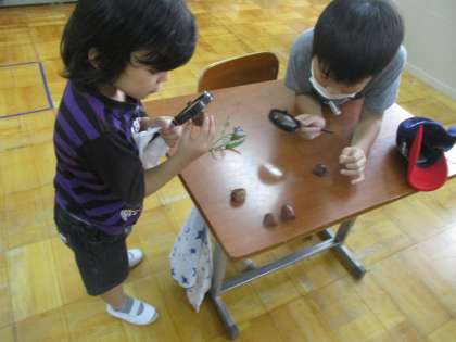 今日3組の畑へ行くと,畑の近くにあるくりの木にたくさんの栗が大きくなっているのを見つけました。まだ,多くは緑色ですが,いくつかの栗は木の下に落ちていて,美味しそうな栗になっていました。早速,教室に持って帰って見ていました。これからも秋をいっぱい探したいと思っています。