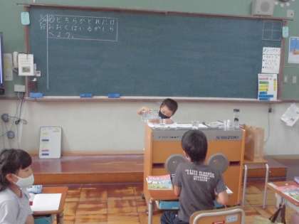 今日は,二つの入れ物に入るかさがどれぐらい違うのかを調べる学習をしました。