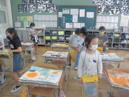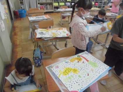 絵の具とクレヨンを使って仕上げたお話の絵の鑑賞をしました。どの子もお話から想像を広げて,楽しく取り組んでいました。