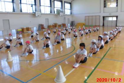 そして,準備体操のEXダンスをおどるときの並び方,80m走のときの並び方,リレーのときの並び方を確認しました。