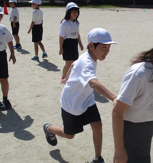 3年生では体育参観の種目「リレー」の練習をしました。まずは,バトンパスの練習から。リレーバトンを左手で受け取って右手に持ちかえます。何回かくり返す中でうまくできるようになってきました。最後に,本番のように一人50mを走ってバトンパスをしました。