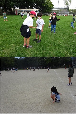 10月7日(水)昨日集まったたてわりグループで,お昼休みに遊びました。体育館に集まったグループは「だるまさんがころんだ」と「ドッチビー」,中庭では「ドンジャンケン」,芝生では「進化ジャンケン」そして運動場では「ダンゴ虫おにごっこ」をしていました。今までできなかった異学年での遊びを楽しんでいました。
