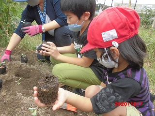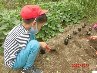 ポットのブロッコリーを3くみの畑に植えかえました。まず,植える位置にポットを並べました。次に,スコップで土を掘って,ポットを優しく裏向けます。苗が痛まないように慎重に行っていました。苗はまだ小さいですが,これから育っていくのを楽しみにしたいと思います。