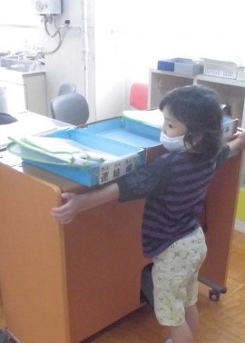 「オルガンは,教室から出せるかな?」と聞くと,手を広げてオルガンの幅をはかり,手を広げたまま入り口にむかってはかっていました。しかし,よく分からないので紙テープをつかってくらべてみることにしました。オルガンの横幅とたて幅に合わせて紙テープを切り取り,入口にもっていって比べました。「たての方が短い。」と分かり,縦向けの方向ならオルガンが出せることが分かりました。実際にオルガンを移動して出せることも確かめました。