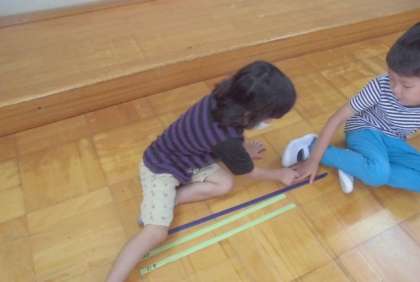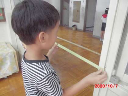 今日は,教室のオルガンと教室の入口,どちらが長いかをはかりました。